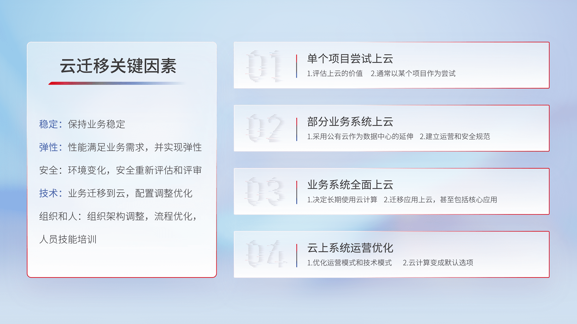 结合实际业务,,,,从规划设计、、云平台选型、、、云原生改造、、、数据迁移、、集成交付,,,迁移全过程为客户识别最佳上云路径,,做好风险识别管理,,设计网络架构、、身份权限、、、、安全审计合规、、、操作审计、、日志审计、、、、监控告警策略、、、多站点容灾设计等,,,,对云上基础设施进行整体规划,,,,提升IT治理水平,,,以满足弹性、、、高可用、、、、高性能的需求。。。