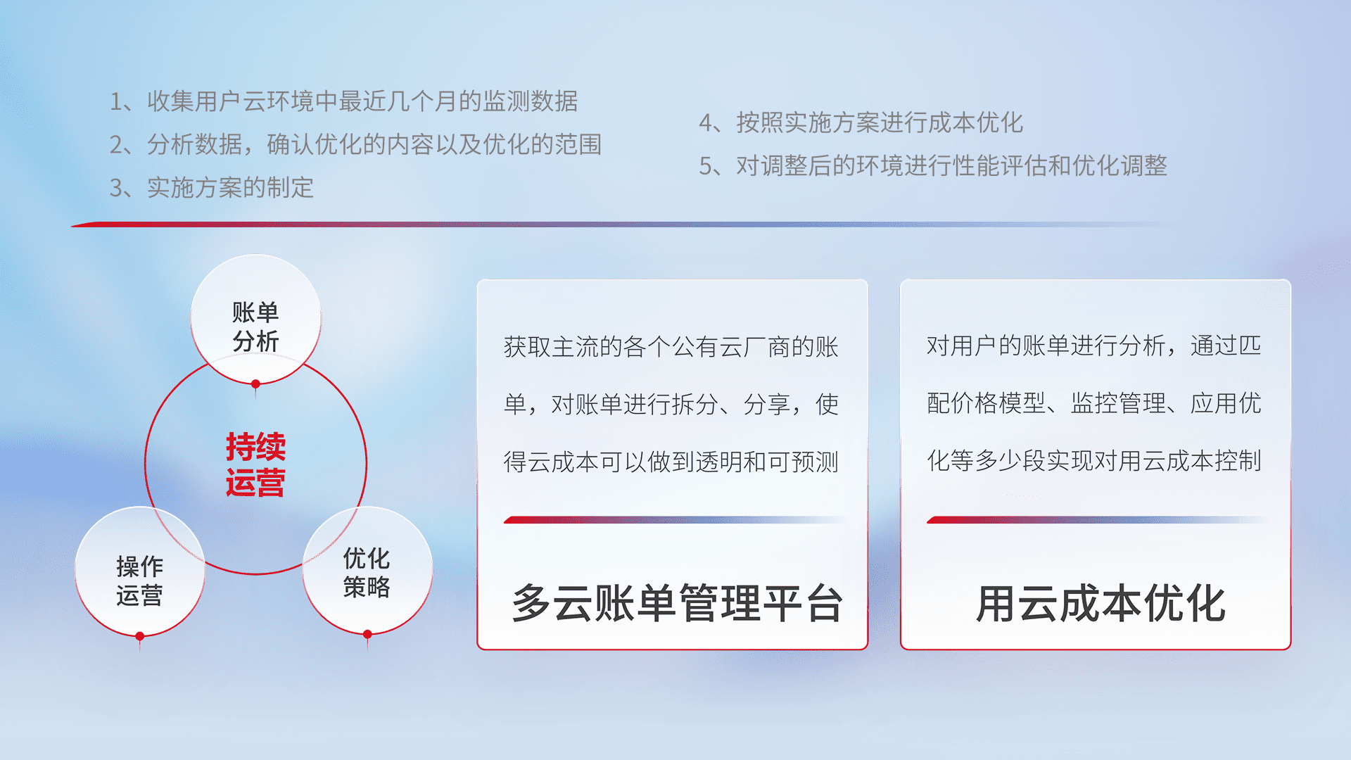 通过多云纳管,,,,以统一的资源数据模型把客户的云资源进行抽象和封装,,,进而实现对多云资源的统一操作,,保障云资源管理的可靠性、、、、稳定性与可用性。。。。量身定制化运维内容,,,,配置、、开发运维、、、、补丁管理、、、、备份、、、、监控、、、认证和访问管理、、、审计和日常巡检等,,,,保障在用云过程中的可靠度,,稳定度以及高可用率。。